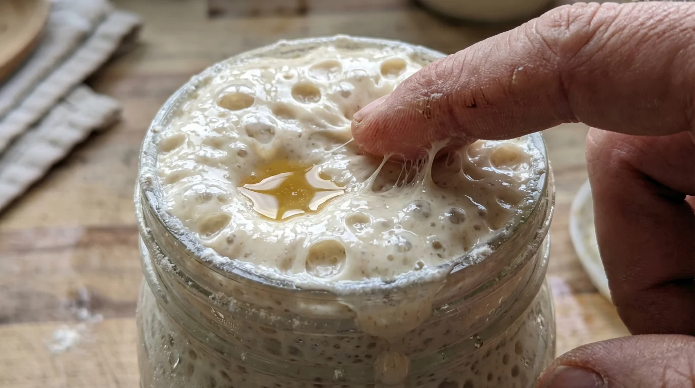 Watch for the moment the surface crests and domes, stretching the structure of the flour. The mixture should tremble slightly when you tap the glass, and pulling a spoon through it should reveal a web of sticky, glutenous strands. This is the visual proof that the yeast has taken total control of the jar.